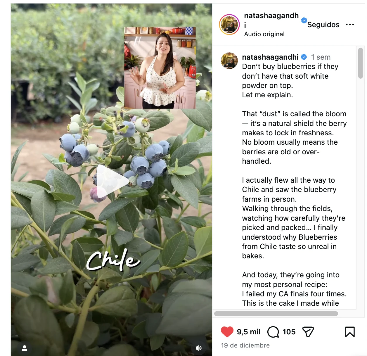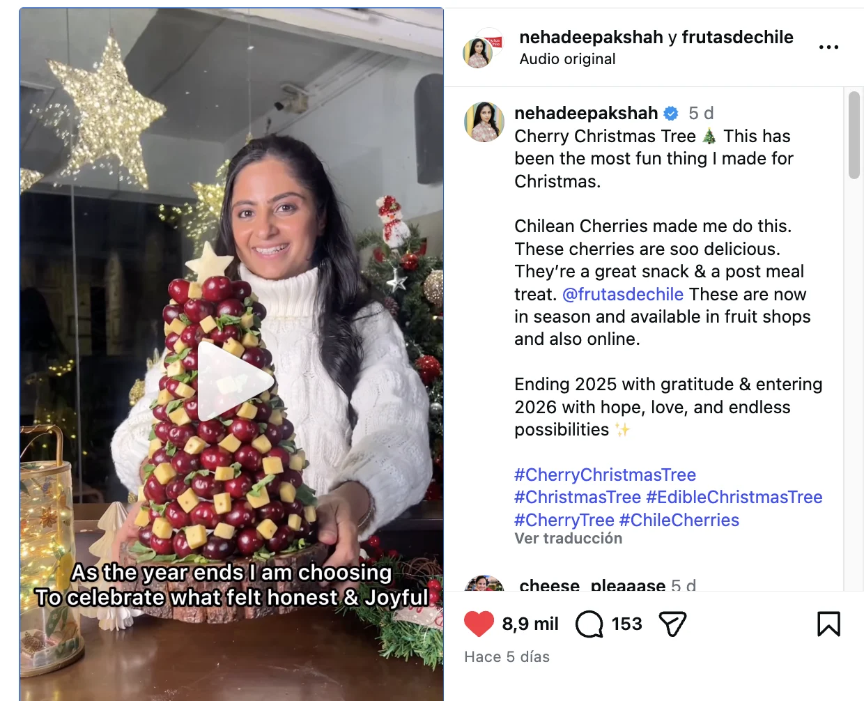 Agregó: «Además, el clima en Chile ha sido increíble, así que creo que estoy oficialmente enamorada de Chile, de sus cerezas y sus arándanos. Son muy frescos y jugosos. En mi casa en India, pedía estas frutas, pero estar en Chile y poderlos comer directamente, cogerlos del árbol y comerlos, fue una experiencia en sí misma que nunca olvidaré. Y no puedo esperar a compartir esto con mi comunidad, con mi familia, con mi público en casa y asegurarme de que todos coman solo los arándanos y cerezas de Chile».
