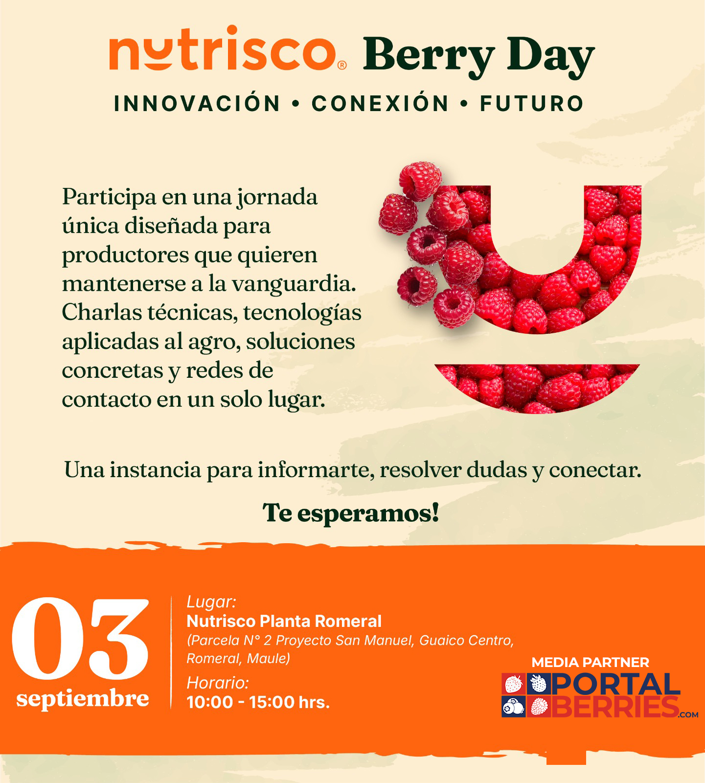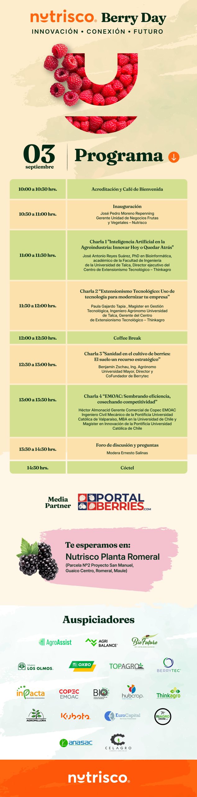 El Nutrisco Berry Day se llevará a cabo el miércoles 3 de septiembre, entre las 10:00 y las 15:00 horas, en la Planta Nutrisco Romeral (Parcela N° 2 Proyecto San Manuel, Guaico Centro, Romeral, Maule).